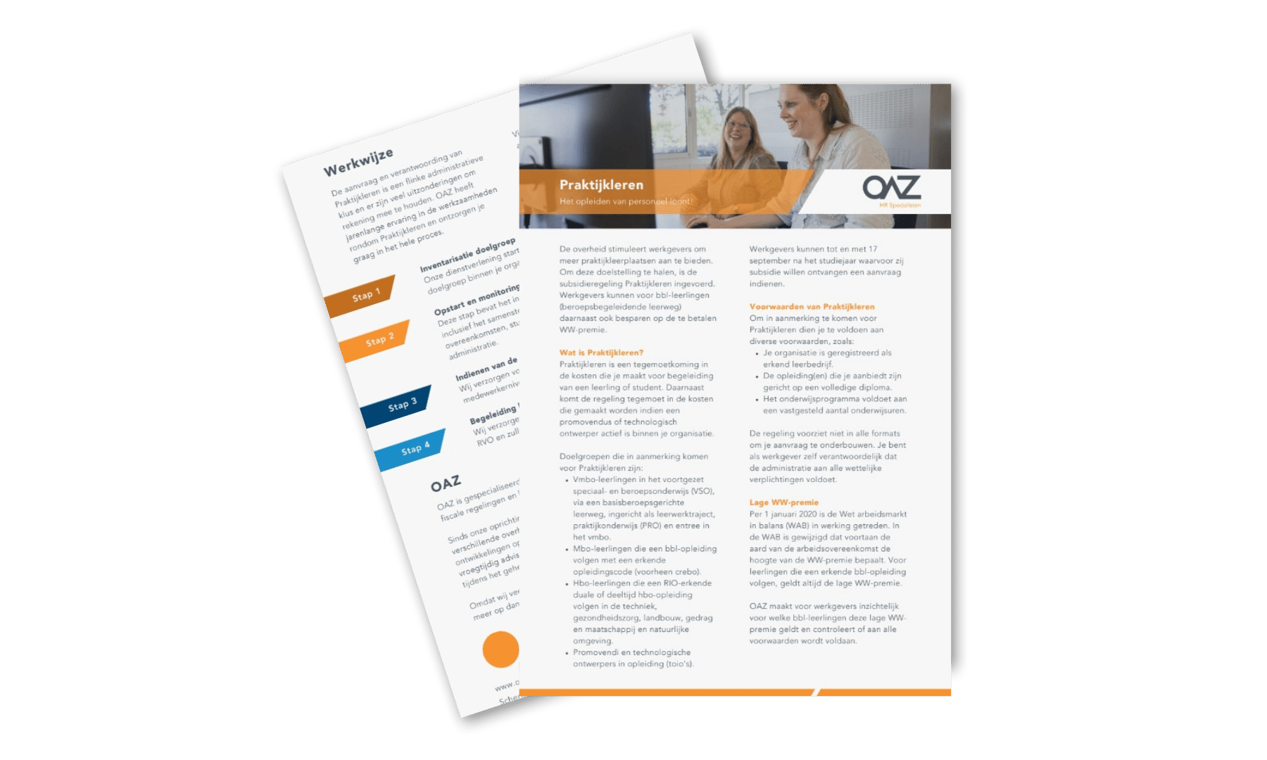 OAZ is gespecialiseerd in het controleren van alle administratie rondom de subsidie Praktijkleren en nemen dit van A tot Z voor je uit handen. Via MijnOAZ ben je daarnaast altijd op de hoogte van de voortgang van jouw subsidie. In de factsheet lichten we de subsidie en onze werkwijze toe.